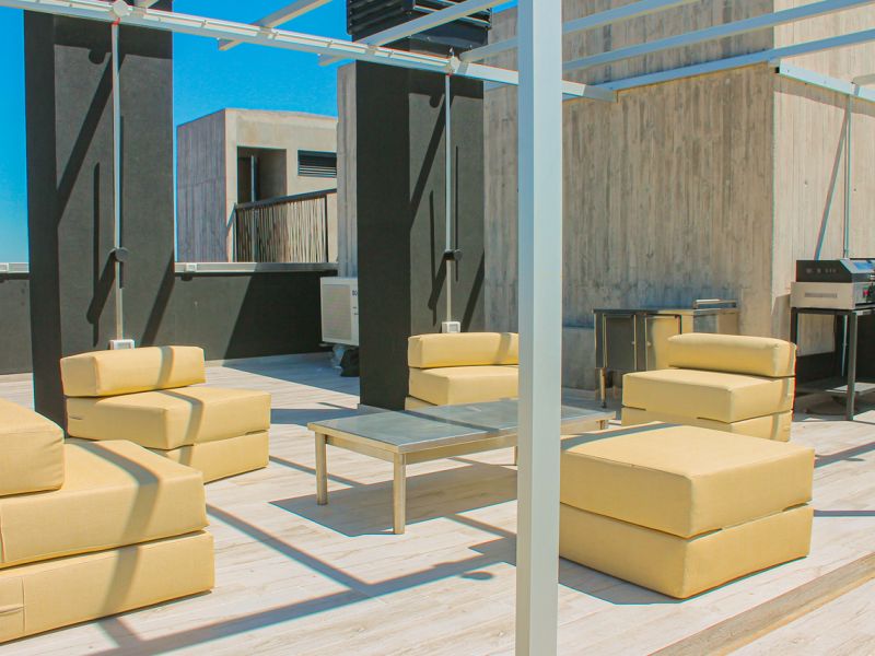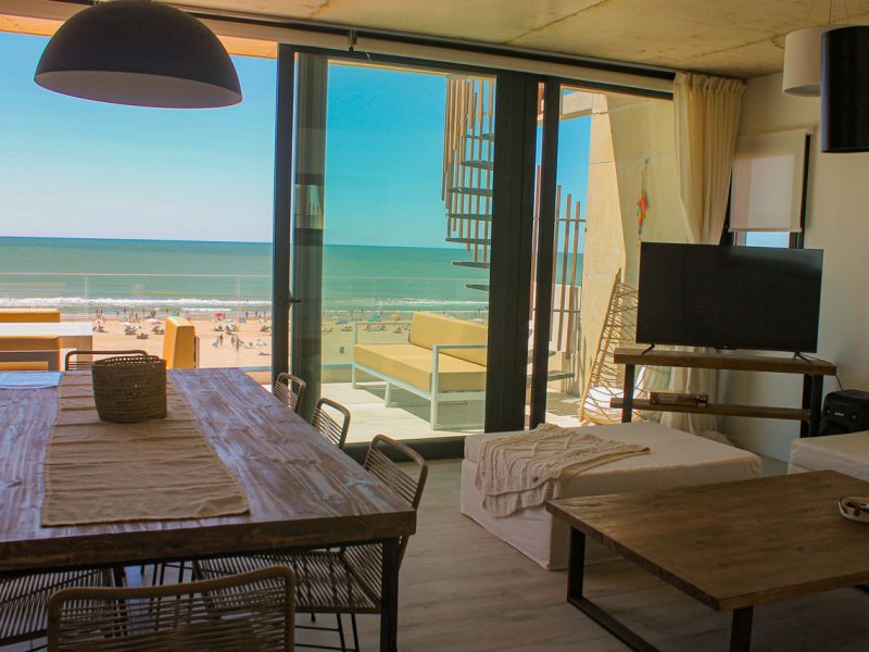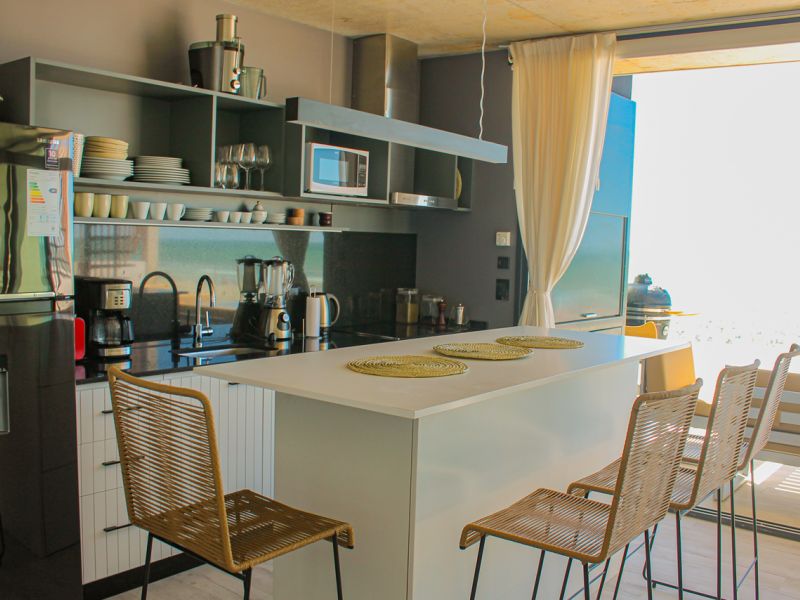 Balcón con vista plena a la playa, parrilla propia, ahumador Kamado y mobiliario de diseño.